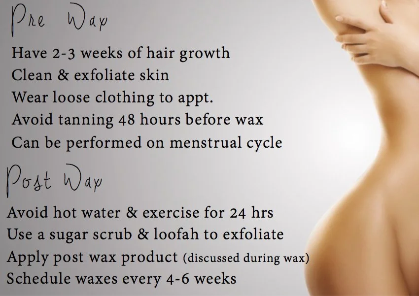 We recommend waiting at least 24–48 hours between waxing & tanning. Waxing exfoliates the the top layer of dead skin cells & skin may burn or become irritated due to sensitivity of sunburned skin. Also avoid taking any blood thinning medication (aspirin, ibuprofen) before to avoid bruising. We do require a minimum of 2 weeks hair growth, 3 is best, or else hair is too short & unable to be waxed. In this circumstance, Brazilian wax will not be charged but a cancellation fee will be applied.